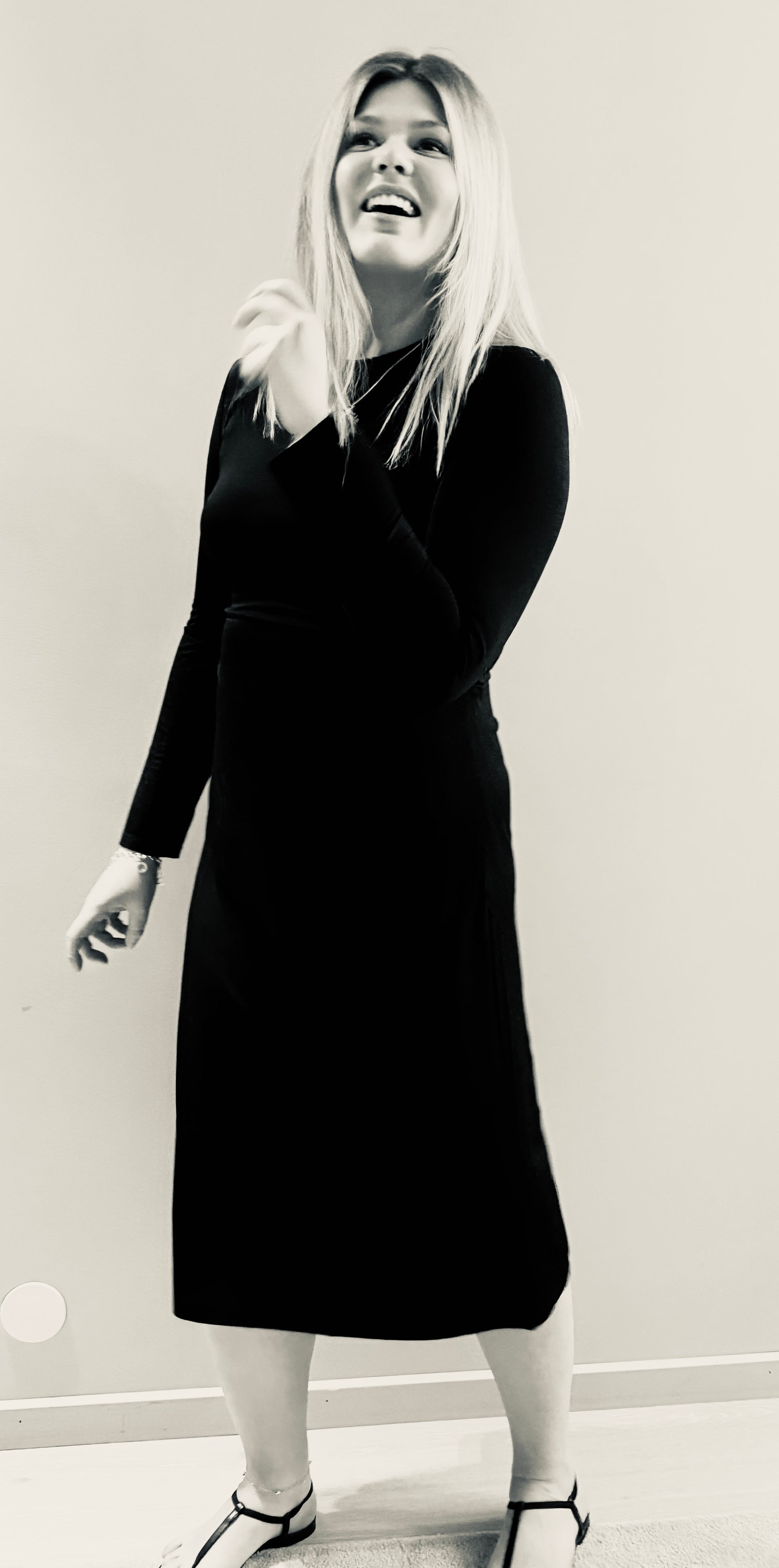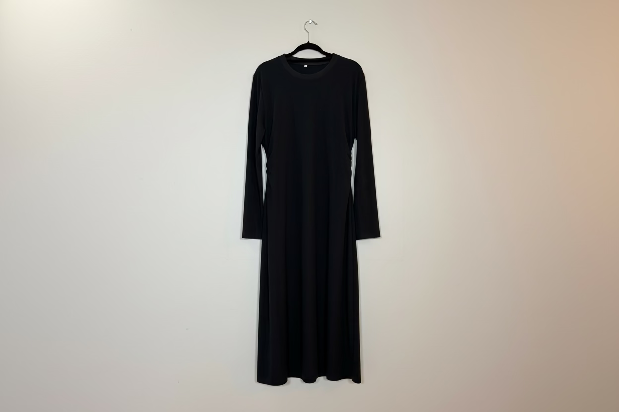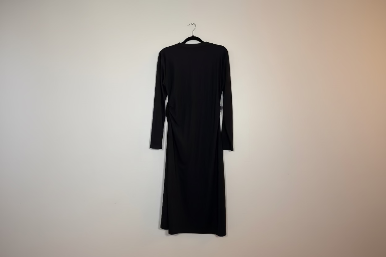 Beskrivning: Denna klänning är skapad för dig som vill känna dig både bekväm och elegant. Med sin mjuka drapering i midjan formar den en smickrande siluett som tillåter rörelse och ger en feminin touch – utan att kompromissa med komforten. Den svarta färgen ger ett sofistikerat intryck och passar lika bra till vardags som fest.